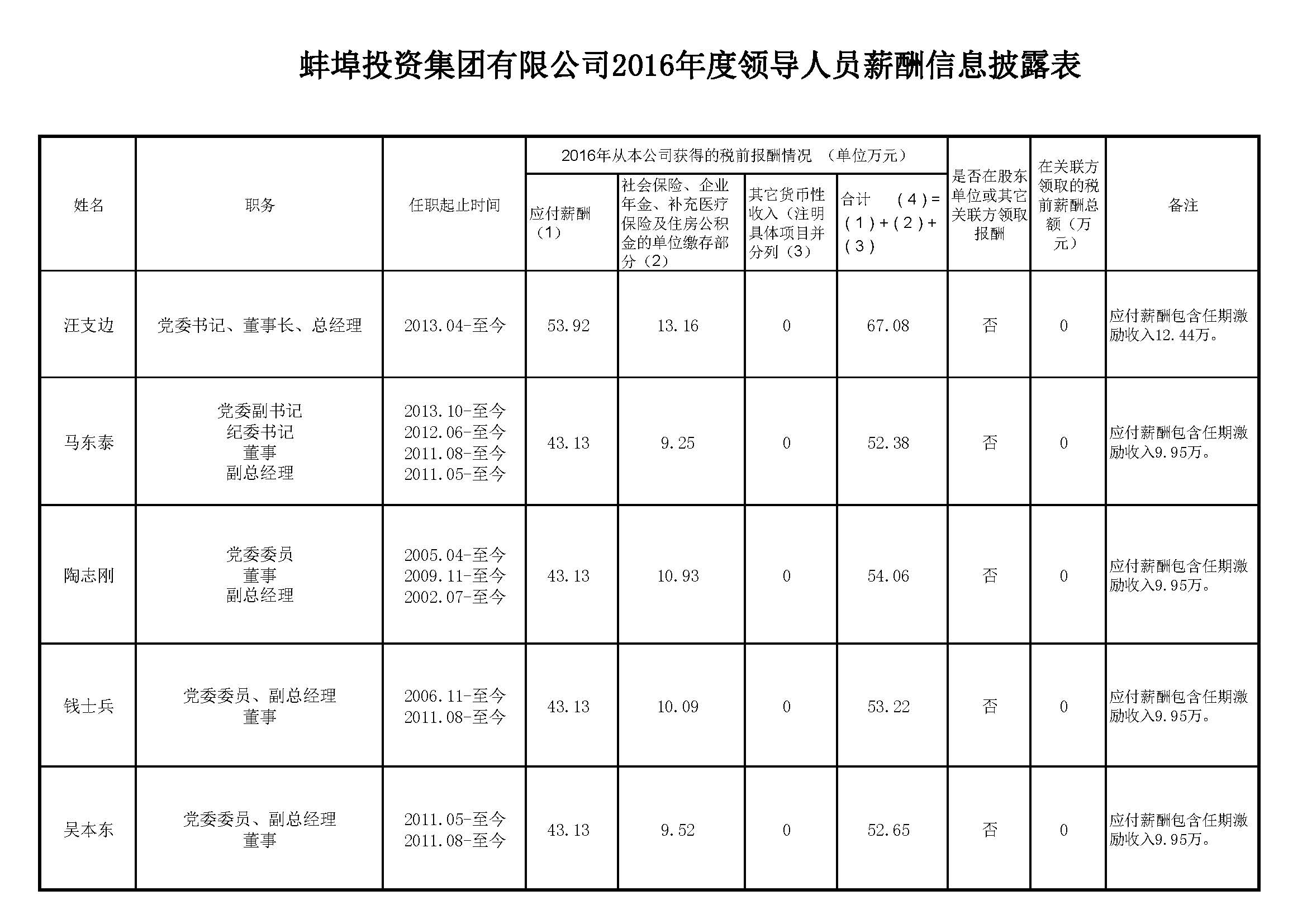 蚌埠投資集團有限公司2016年度領(lǐng)導人員薪酬信息披露